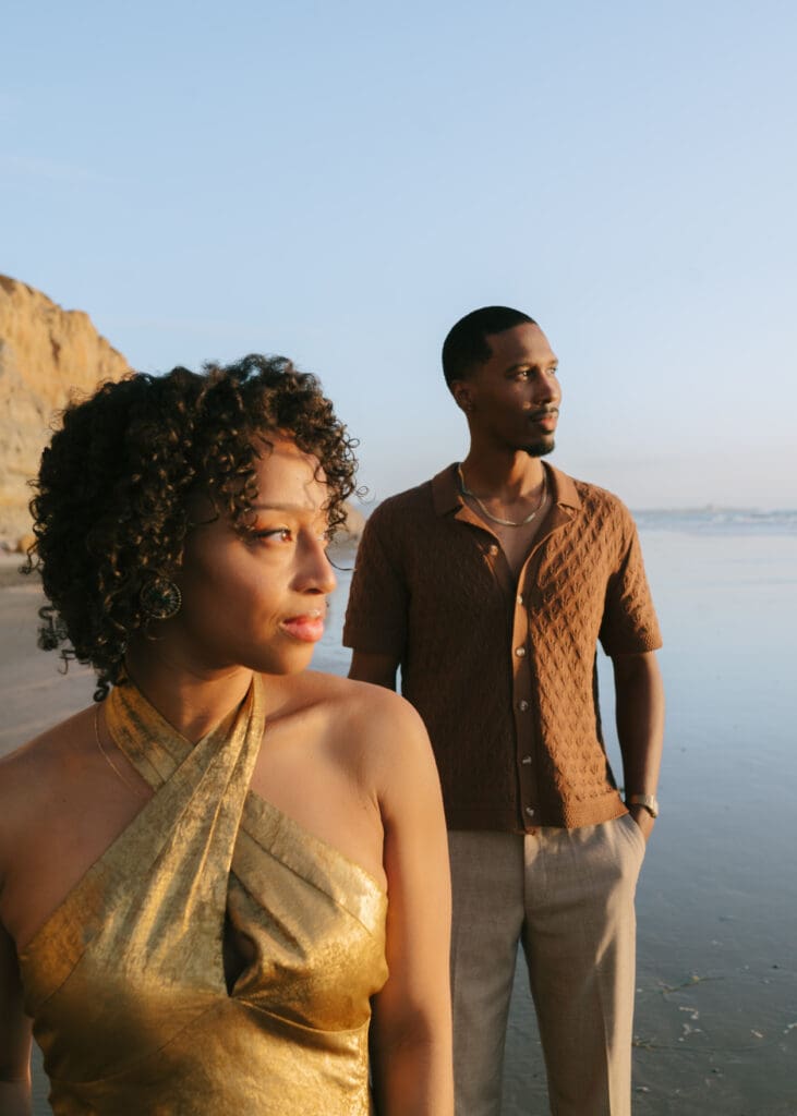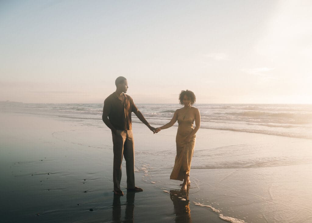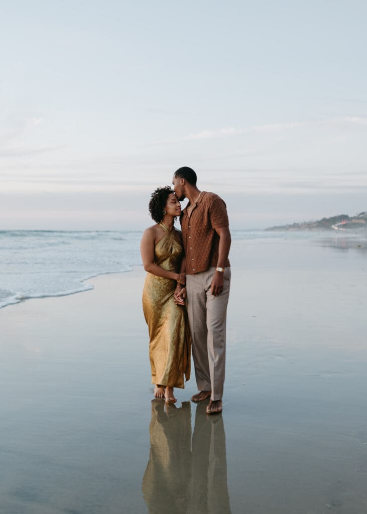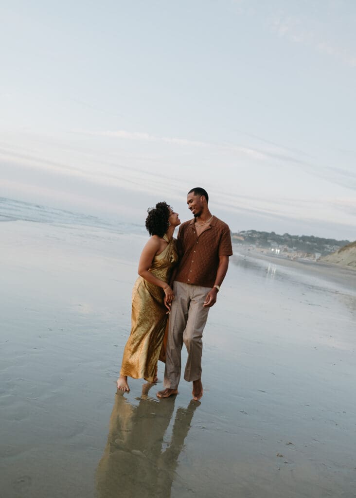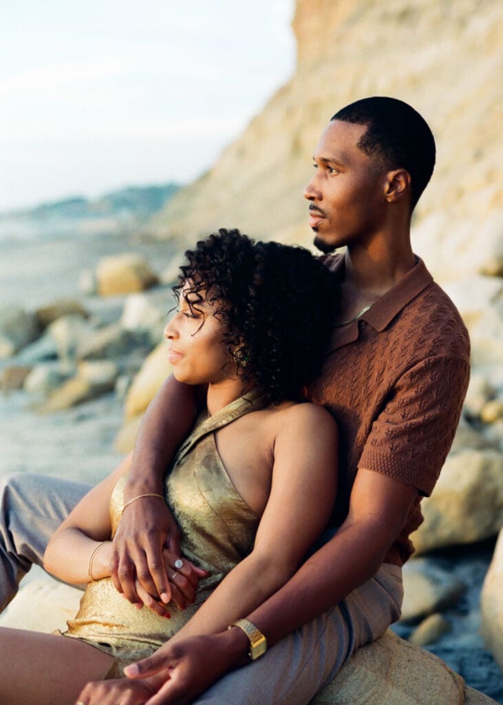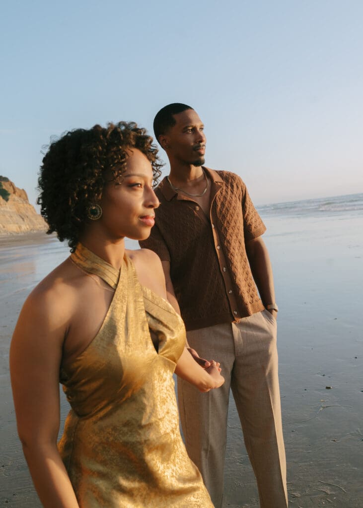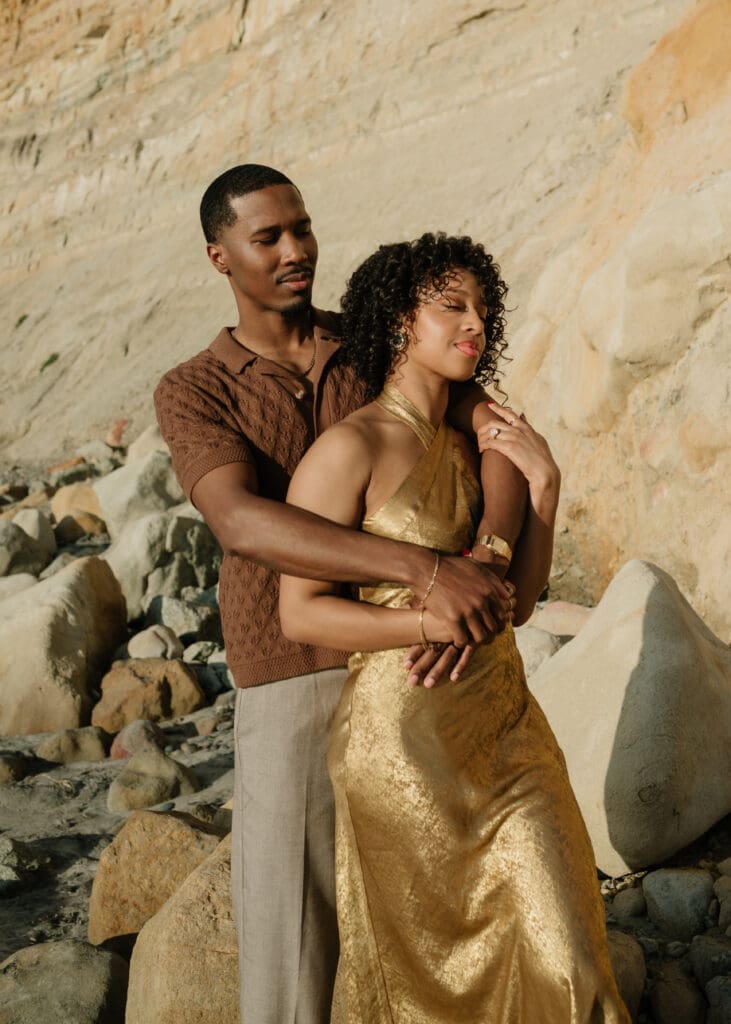 Outfits are another part of planning that couples sometimes feel unsure about, and I’m always happy to help with this part of the process. Send photos, text options, ask questions I’m an open book when it comes to styling help. For sessions in nature, like an engagement session at Torrey Pines or other outdoor spots around San Diego, I usually recommend classic and muted colors. Blacks, whites, creams, browns, grays, and soft neutral tones photograph beautifully and keep the focus on the connection between the two of you.