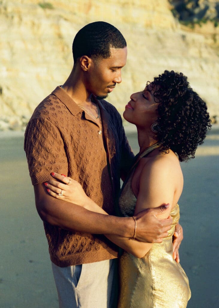 Alexis and Terrance will be getting married later this year, and when it came time to plan their engagement photos, they knew they wanted something classic, soft, and natural. We decided on Torrey Pines State Beach, one of my favorite locations for an engagement session in San Diego. With the cliffs, open coastline, and the way the light settles there at sunset, it creates such a calm and beautiful backdrop. Evenings like this one tend to unfold really naturally. We walked along the shoreline, let the session move at an easy pace, and photographed as the sun slowly and candidly. Engagement sessions are meant to feel relaxed; a chance to spend time together and document this season before the wedding day arrives.